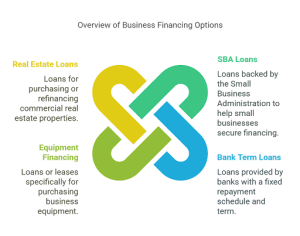 Traditional bank loans offer competitive interest rates but require a strong credit history and financial performance. These loans range from $50,000 to millions, with repayment terms from 5 to 20 years.